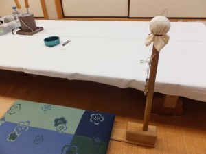 実は金属製の便利なものが出来る以前は、写真のように、くけ台には輪にした紐を付けて置き、布にさした針に引っ掛けて使っていたからです。